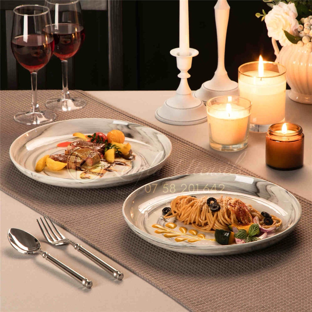 - SPACE SAVING & EASY TO CLEAN – These marble plates can stack nicely on top of each other for compact storage in a cupboard and save you space. The smooth surface is not easy to stick and avoids from remaining, which makes them easy to clean, and you can clean them in the dishwasher or hand wash them with soap and hot water. The gloss still looks like new after a long time of use.